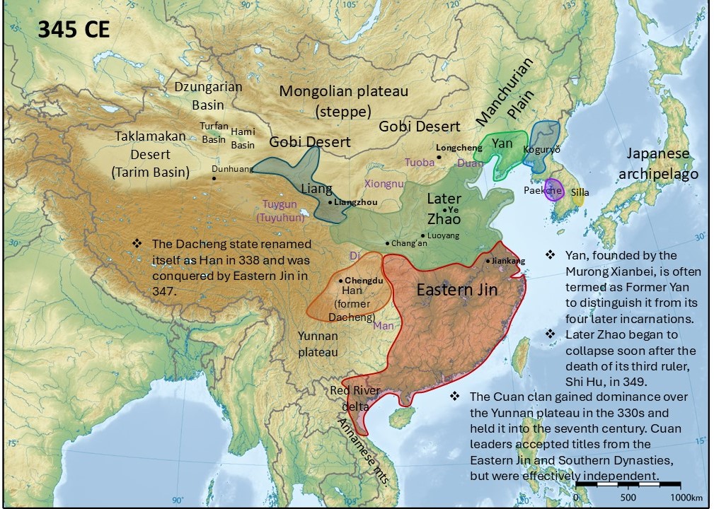 [Translator’s note: In 350, Shi Min killed Shi Jian, reverted to his father’s original surname Ran, and proclaimed himself emperor of a new dynasty called the Wei. The Wei regime was immediately challenged by another of Shi Hu’s sons, Shi Zhi, who had the support of the surviving Jie population, as well as the Qiang and Dī peoples (who presumably also feared being targeted for genocide). Ran Min defeated Shi Zhi’s regime in 351, but was ultimately captured and killed in 352 by the invading Murong Xianbei of the Former Yan state. The former territory of Later Zhao was then partitioned between Former Yan, Former Qin, and Eastern Jin.]