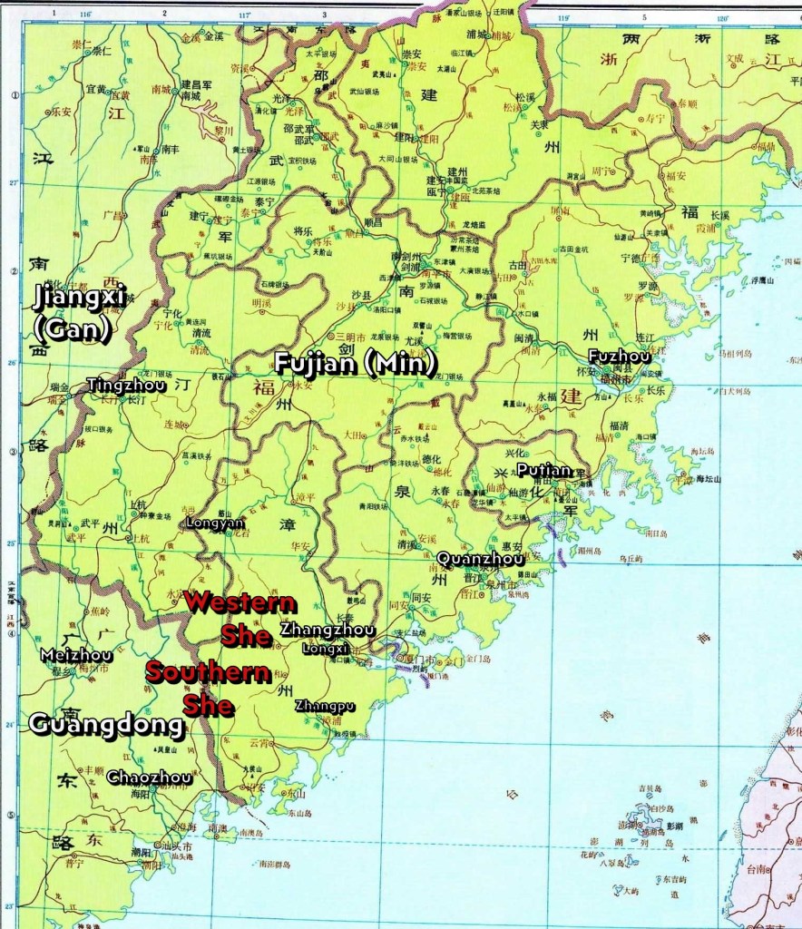 - The southern She were probably connected to Tingzhou (and indirectly to Jiangxi) through the Ting River, to Meizhou through the Mei River, and to Chaozhou through the Han River (of which the Ting and Mei were both major tributaries). ↩︎